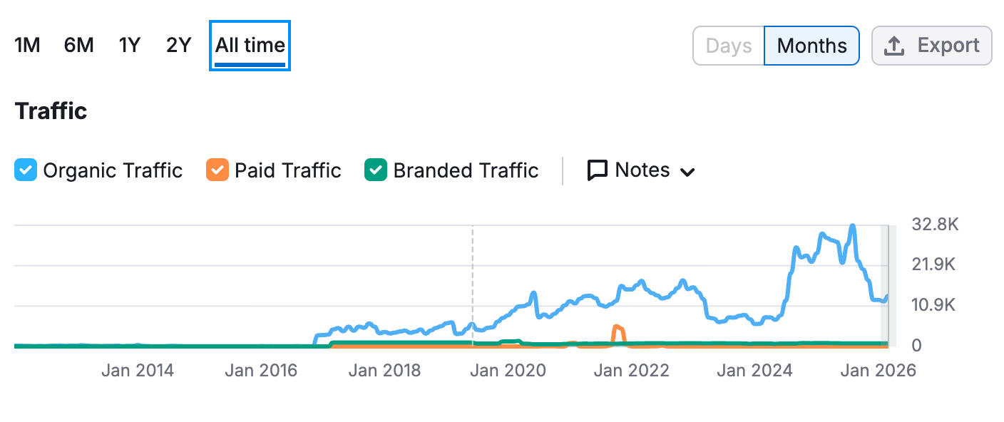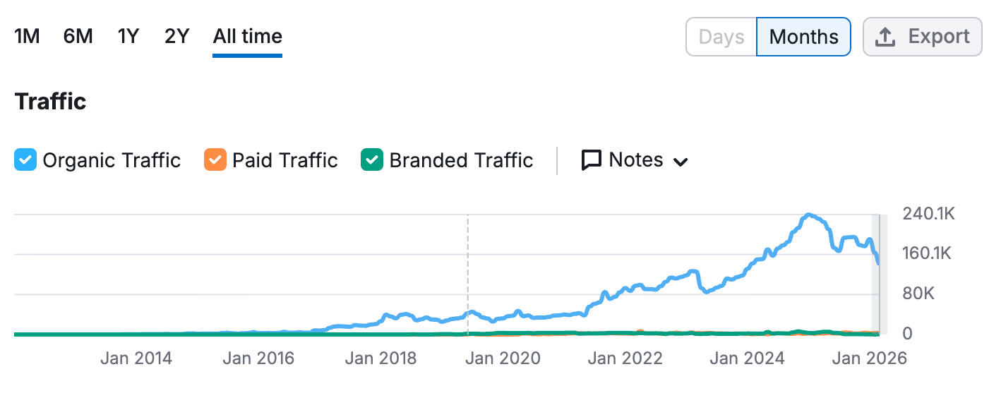 At Koordinates, I helped index and SEO tens of thousands of public geospatial datasets. In many case, we outranked the official government source.In the chart below, I'm responsible for initial push in 2018-2019. I also returned for six months in late 2023 and optimised their data listings for the 2024 surge.See more at Koordinates.