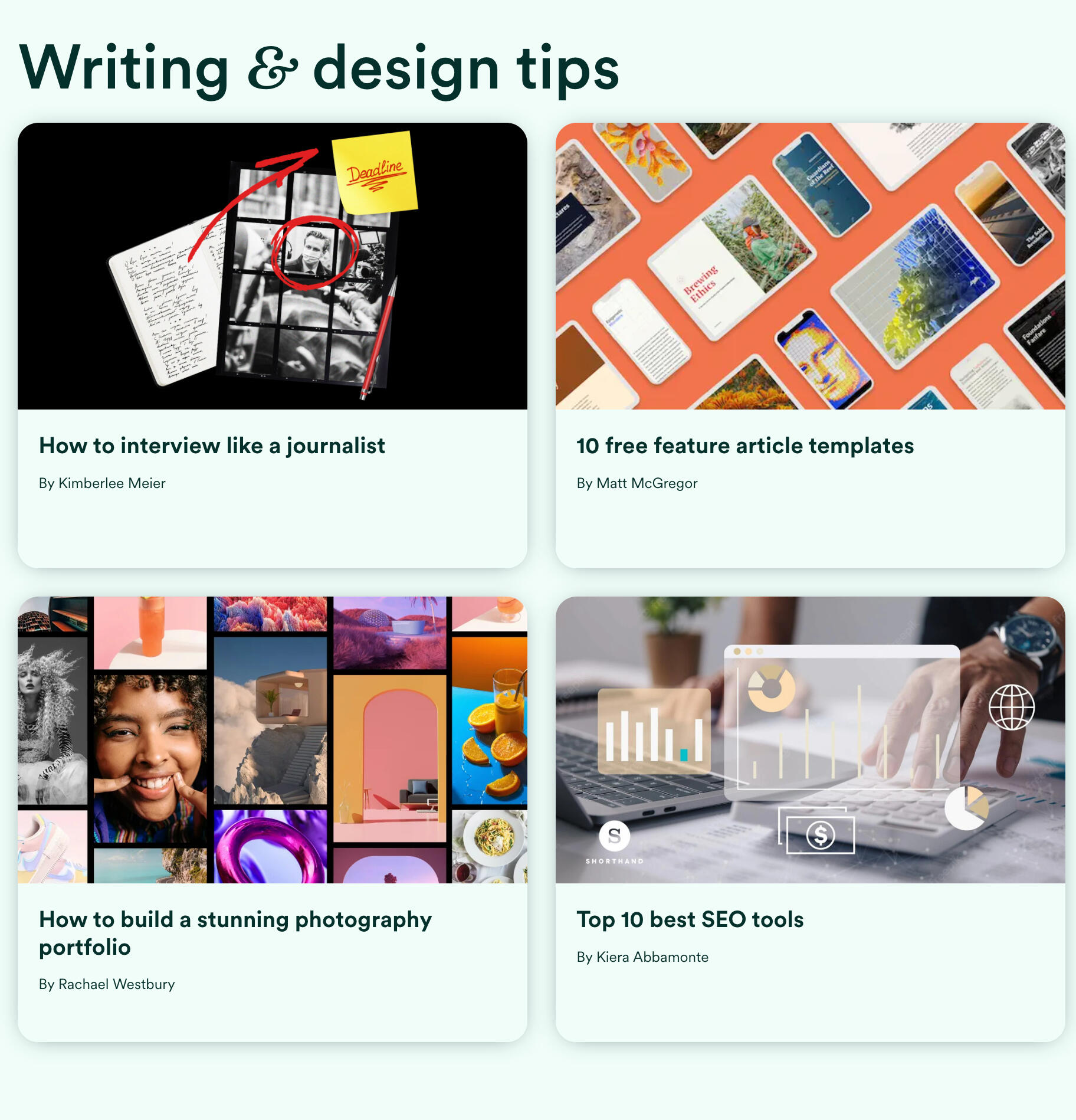 At Shorthand, I built out an engine to produce quality, on-brand content that ranked well in search. This process included hiring a team of freelance writers and designers, building out a suite of tools to assist, and regularly updating content to outrank our much larger rivals.The content produced since my arrival in early 2020 is still responsible for the lion's share of their organic traffic.See more at Shorthand.