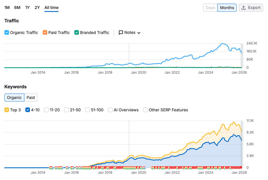 At Koordinates, I helped index and SEO tens of thousands of public geospatial datasets. In many cases, we outranked the official public source.In this chart, I'm responsible for the initial push in 2018-2019. I also returned for six months in late 2023 and optimised their data pages for the 2024 surge.